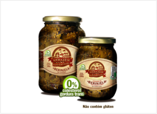- CONSERVA ORGÂNICA DE BERINJELAS Receita original elaborada com ingredientes cuidadosamente selecionados.Tem como diferencial um sabor agridoce, conferido na sua elaboração pela utilização de uvas passas flambadas em vinho licoroso doce e do aceto balsâmico de Modena, com mínima adição de sal.